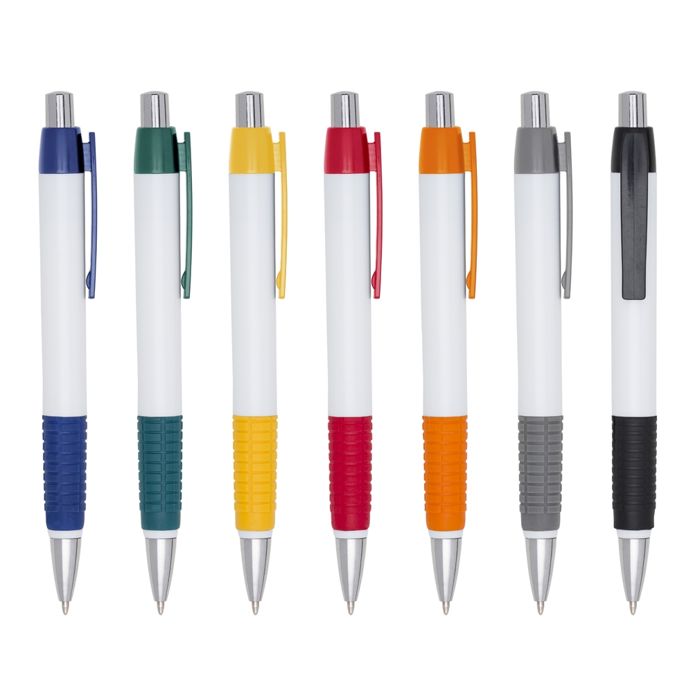 Descrição: Caneta plástica corpo branco com detalhes coloridos. Clip plástico e detalhe inferior emborrachado com relevo, acionador e ponteira prateada(plástico). Aciona por clique.