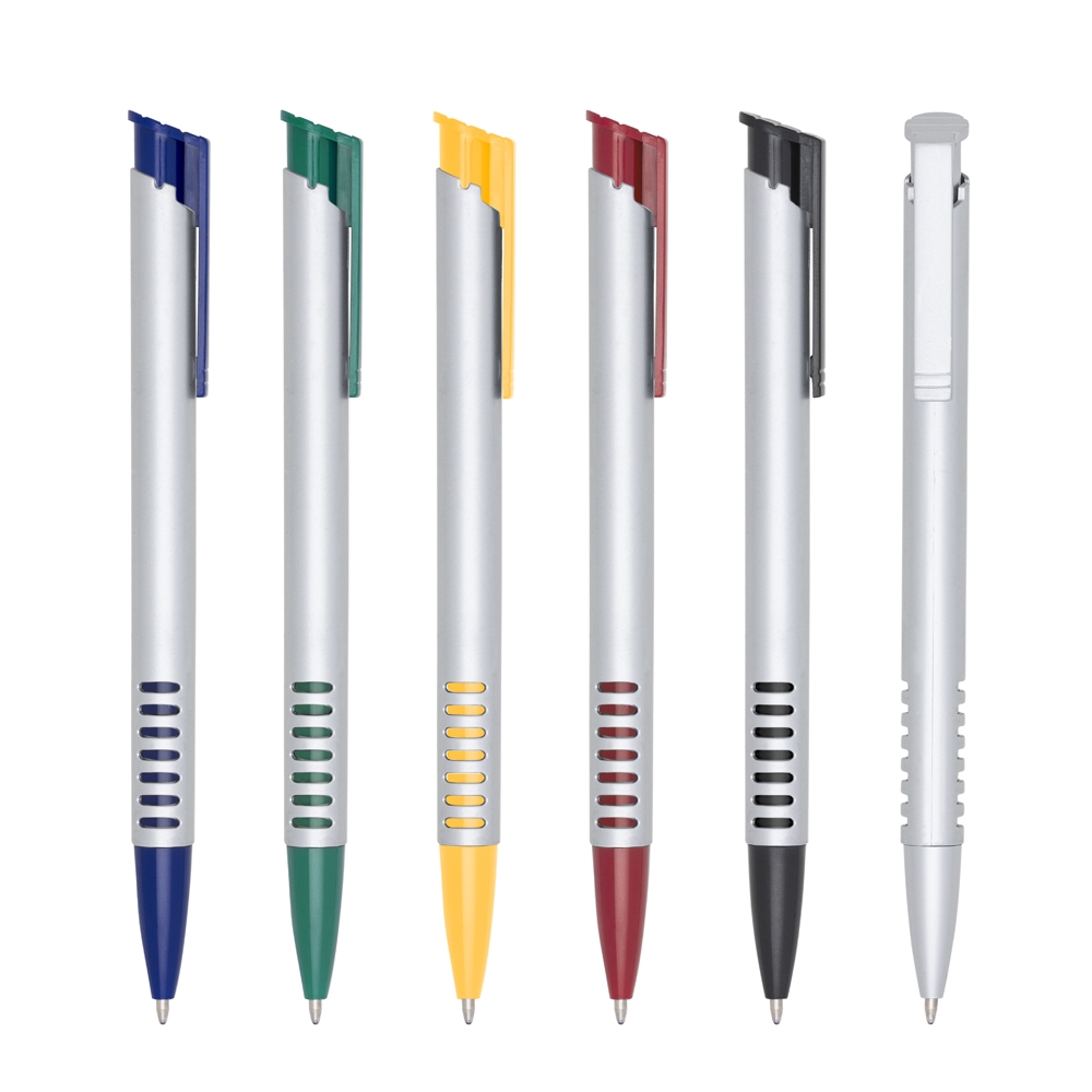 Descrição: Caneta plástica corpo prata com detalhes coloridos. Clip plástico colorido e parte inferior com sete linhas coloridas. Aciona por clique.