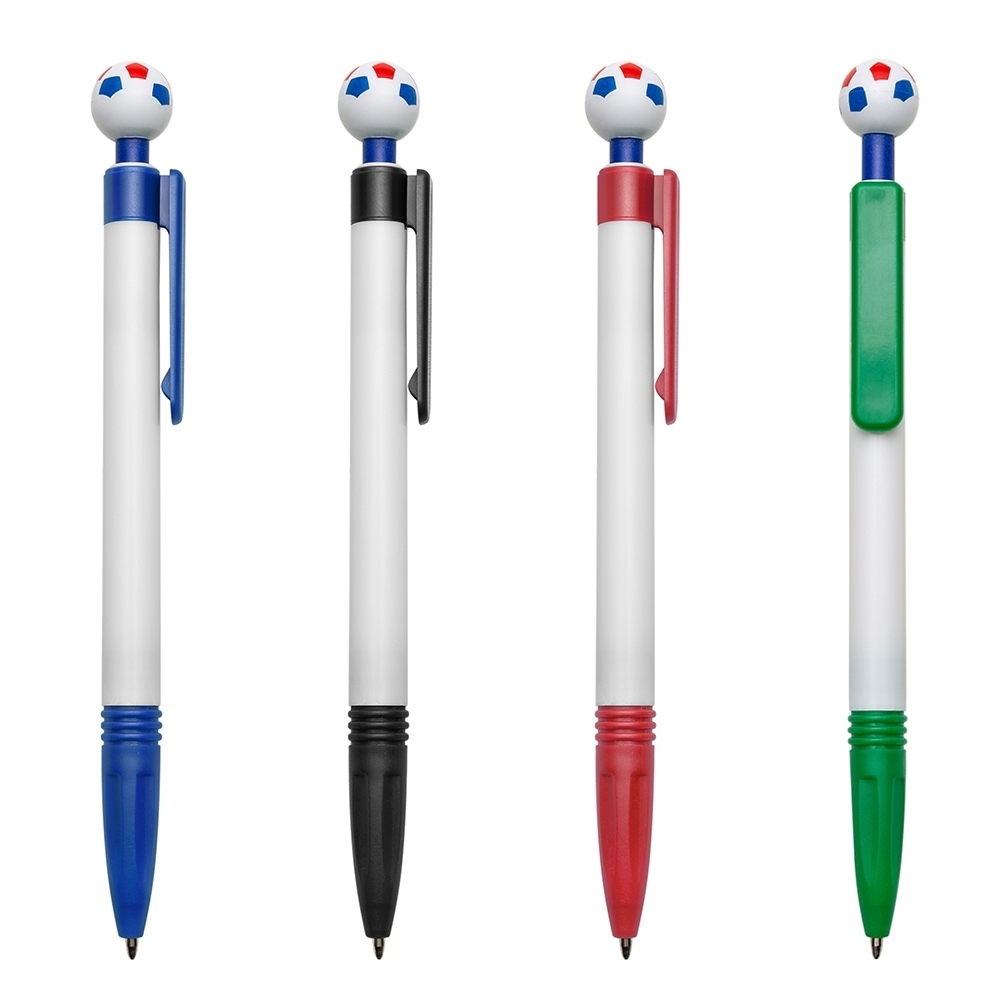 Descrição: Caneta plástica com acionador bola de futebol, possui corpo branco e detalhes coloridos. Ponteira com três anéis e detalhes em relevo, esferográfica azul com acionamento por clique.