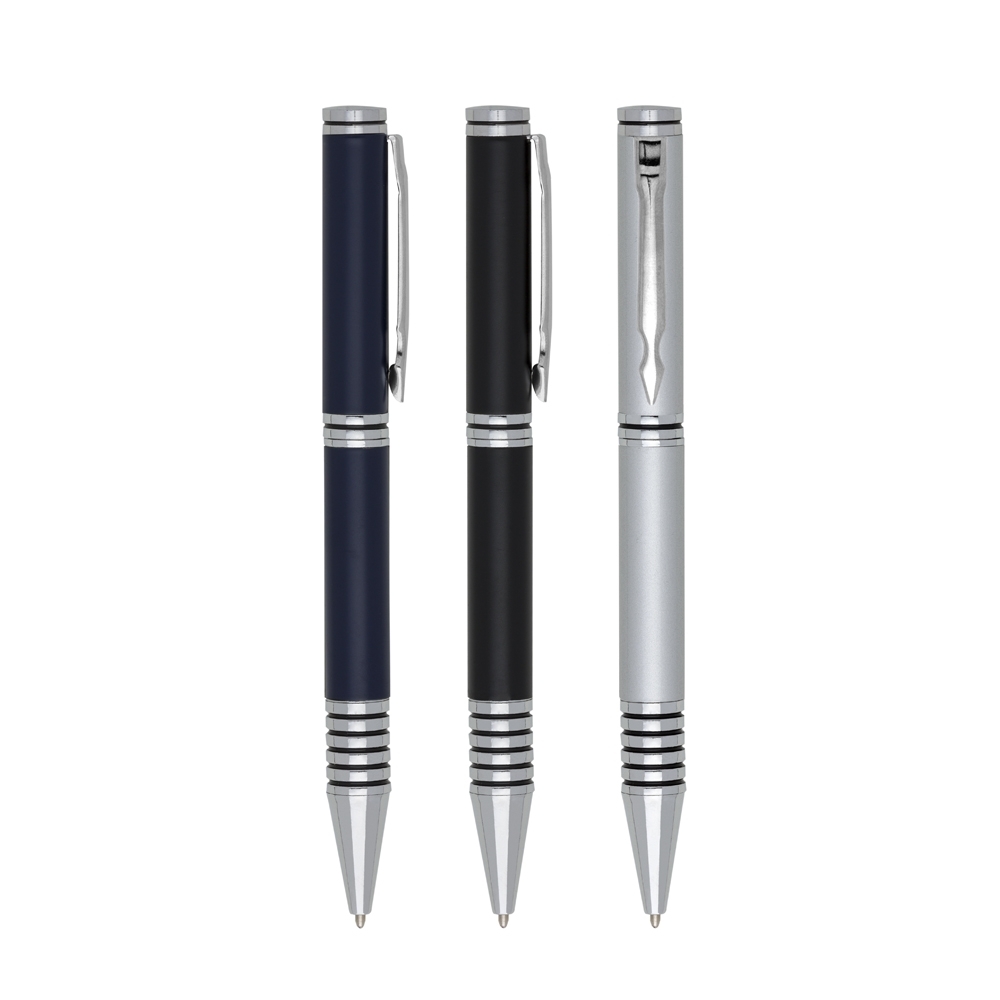 Descrição: Caneta metálica com carga esferográfica azul e acionamento por rotação.